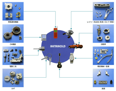 これらの加工技術に第五世代の全く新しい加工技術として開発したMIM(Metal Injection Molding)プロセス「メタモールド」は、長年培ってきた冶金技術をもとに、省資源、省エネルギー型でありながら、プラスチック製品、ダイキャスト製品と同様の複雑形状部品の製造を可能にしました。